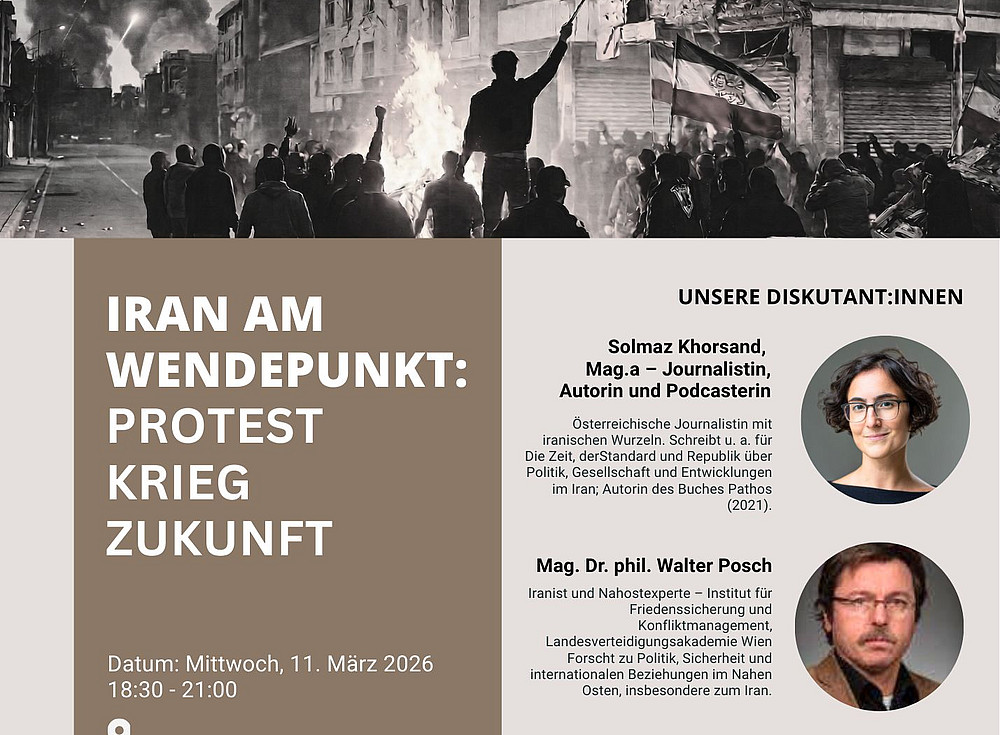 Podiumsdiskussion am 11.3.26 an der Universität Graz mit Dr. Walter Posch, der Journalistin Mag.a Solmaz Khorsand, moderiert vom Friedensforscher Josef Mühlbauer.